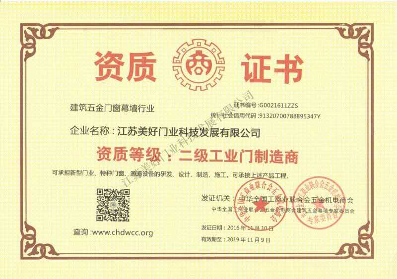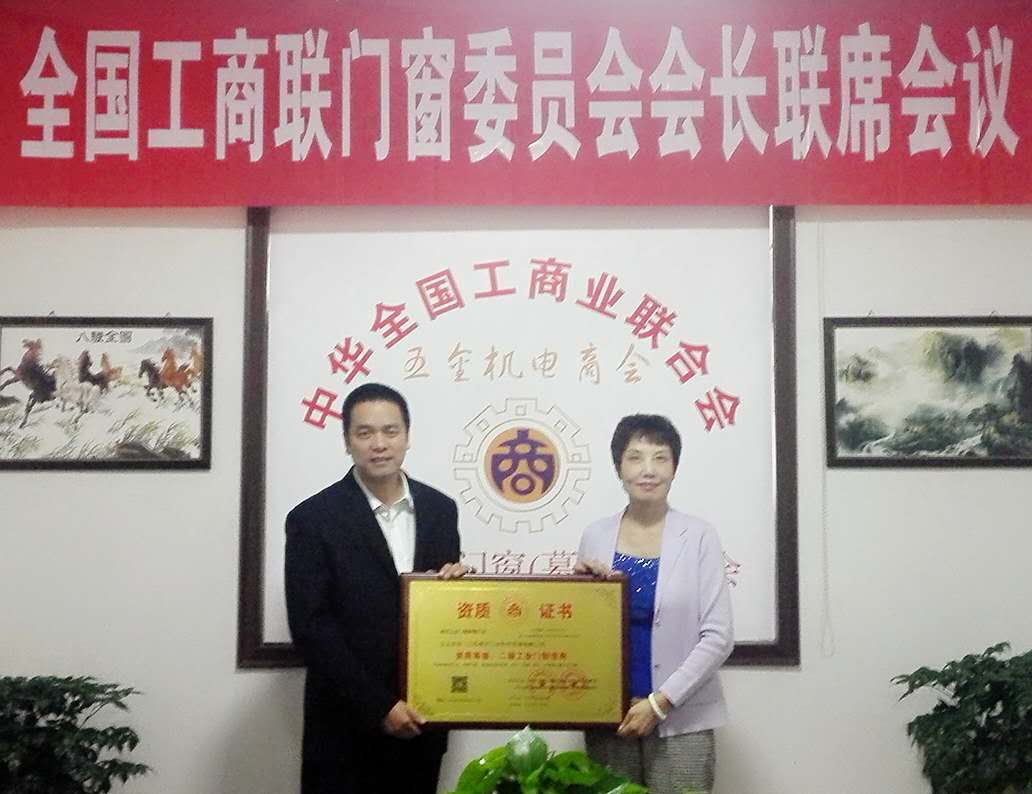 全國工商聯(lián)門窗委員會常務(wù)副會長隋曉麗女士為江蘇美好門業(yè)科技發(fā)展有限公司董事長潘國柱頒發(fā)“二級工業(yè)門制造商”資質(zhì)證書
