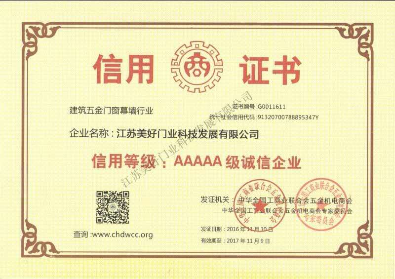 全國工商聯(lián)門窗委員會秘書長張秀梅女士為江蘇美好門業(yè)科技發(fā)展有限公司董事長潘國柱頒發(fā)“AAAAA級誠信企業(yè)”信用證書。