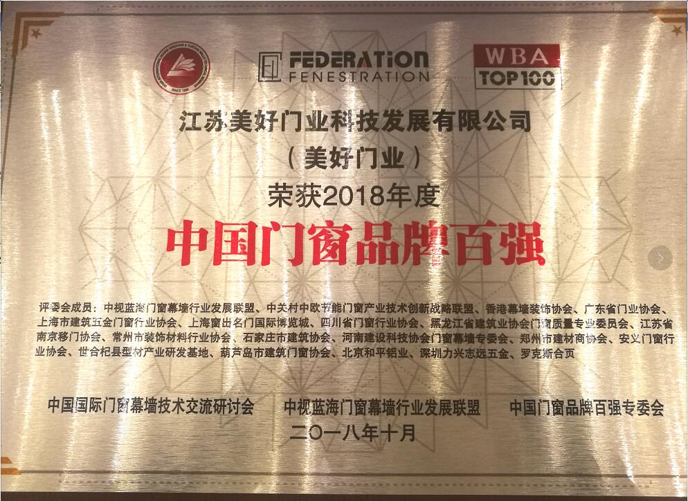 江蘇美好門業科技發展有限公司喜獲“中國門窗品牌百強”大獎