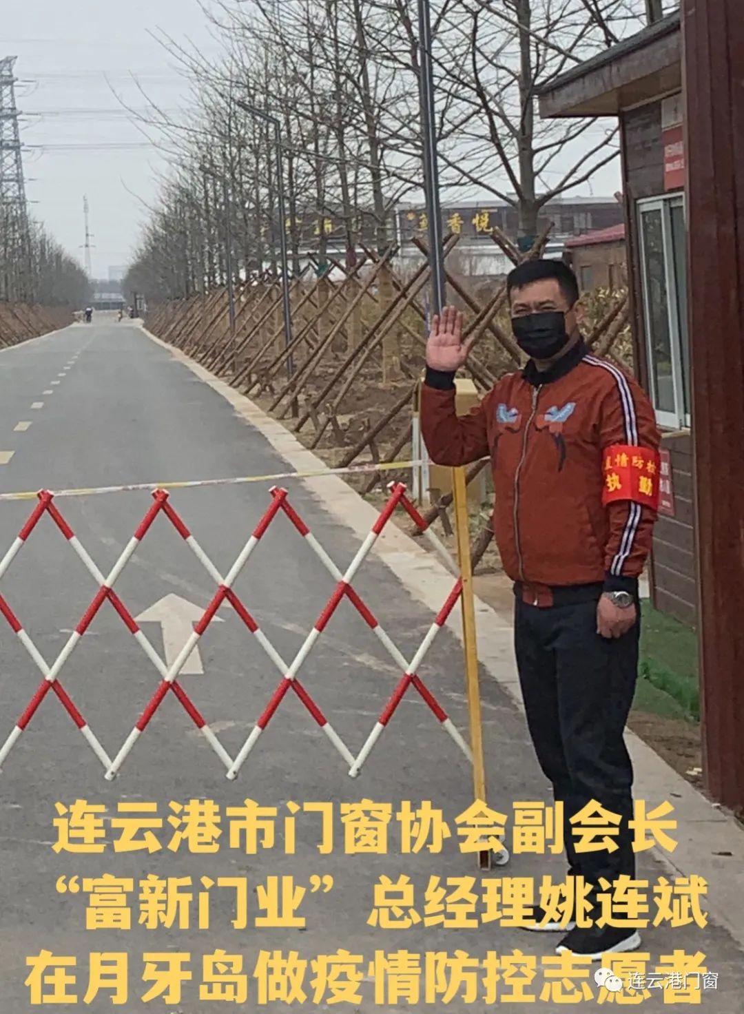 ? ? ? 連云港市門窗協(xié)會副會長(富新門業(yè)總經理)姚連斌在月牙島做志愿者參與抗疫工作。