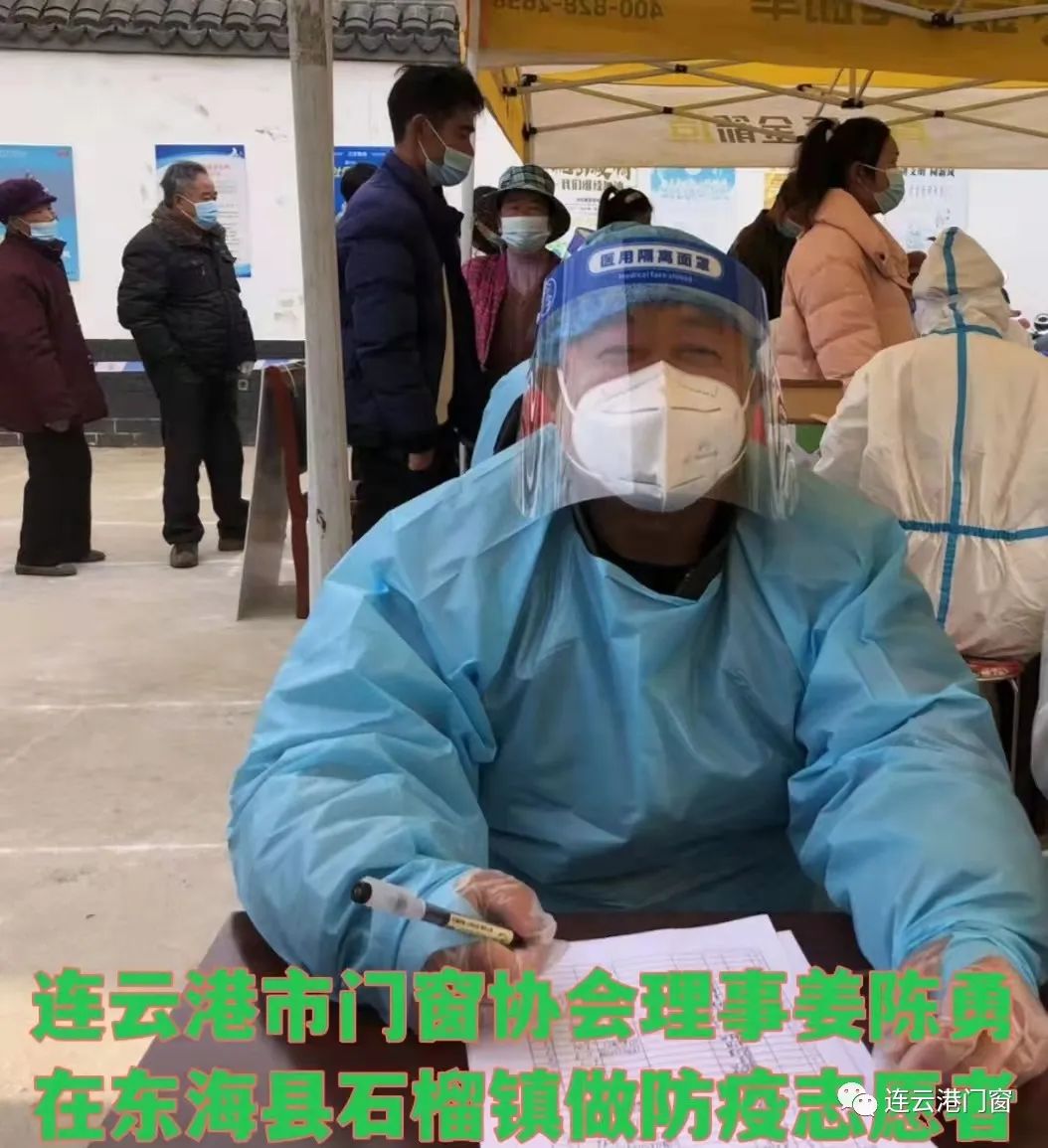 ? ? ? 連云港市門窗協(xié)會理事(東海百勝門業(yè)總經理)姜陳勇在東海縣石榴鎮(zhèn)做自愿者參與抗疫工作。